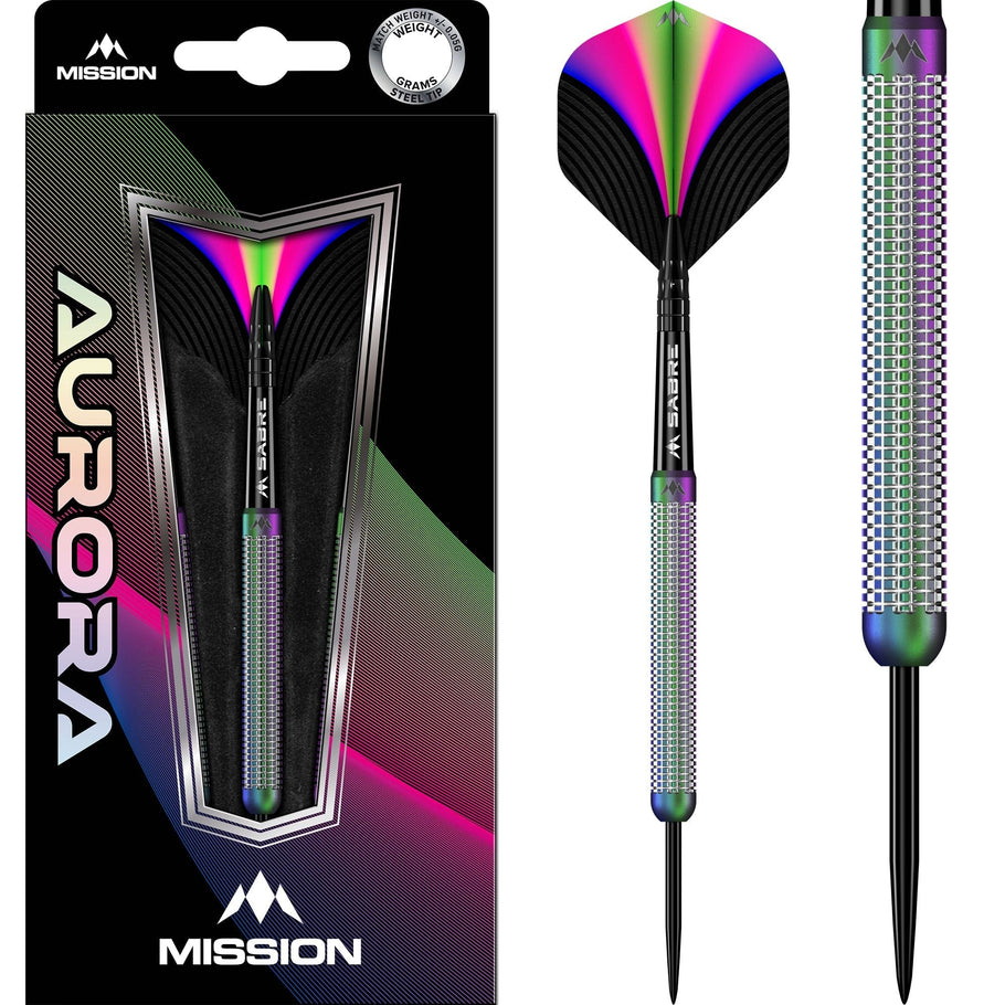 Mission Aurora Darts - Steel Tip - 90% - Coral PVD - 25g. Shake up the darts world with the Mission Aurora Darts. Made from 90% tungsten and featuring an eye-catching coral PVD coating, the Aurora dart will add an explosion of colour to your darts setup. This straight barrel dart includes fine radial and horizontal milled cuts across the entire length of the barrel. A bull nose at the front of the barrel leads to a black point, with the Mission logo laser-etched at the rear of the barrel. The rear of the barrel leads to a black Mission Sabre shaft which keeps the flight firmly in place. The dart is complete with a Mission Aurora flight that features a bright and colourful design. Available in a range of weights in both steel tip and soft tip.