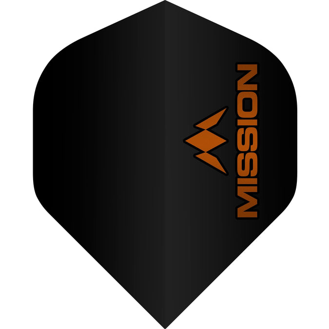Mission Logo Dart Flights - 100 Micron - UV Finish - No2 - Std - Black - Coloured Logo. Mission 100 Micron Spot UV Flights are constructed from a sturdy 100 micron material, giving these flights durability and a highly consistent performance. The Mission flight production process utilises the latest digital print technology to give the flights a striking visual finish alongside a matt surface, maintaining excellent grip to the shaft. Mission Logo Dart Flights - Strong 100 Micron Material. Each pack contains 3 flights. Mission Logo Dart Flights
