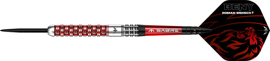 Mission Roman Benecky Steel Tip Tungsten Darts - 90% Tungsten. Features: 90% Tungsten Barrels, PVD Coating, 1 Set of Mission Flights, 1 Set of Mission Shafts with S-Lock rings, Point Protector. The Mission Roman Beneck darts combine the power and heritage of the Czech Lion with innovative darting technology! The bright red of the barrel reflects the Czech flag, but the precision engineering gives dazzling grips and a powerful trajectory. The Mission Roman Beneck is a straight barrel design with both fine and contoured radial grooves along the full length of the barrel with small horizontal milled cuts to create extra grip. The barrels striking visual design is achieved by red electroplating with black electroplating to the rear, followed by precision re-machining to exposes the Tungsten underneath. The dart is signed off with a Mission logo, laser etched into the rear of the barrel, and a Sabre shaft in transparent red with black aluminium top to tightly grip the Roman Beny Beneck signature flight. Harness the power of both Roman Beny Beneck and the Czech Lion with these mighty darts!