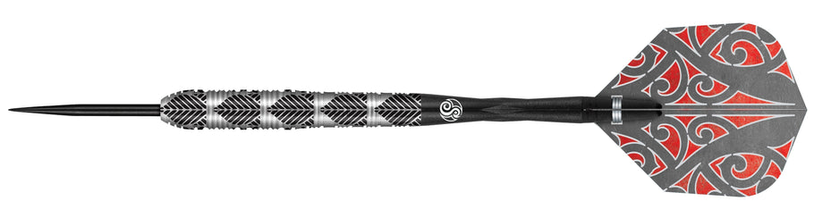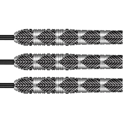 Shot Warrior Darts - Steel Tip - 90% Tungsten - Awe. The Awe's torpedo shape is perfect for players who grip at the front. A short nose with .5mm grooves is followed by a double-toothed ring grip machined along the barrel. The design has a rear taper, which aids the balance at the front. Wide smooth rings are added between each band on the tail section, resulting in a less aggressive grip. This set has a cinder grip in a tribal design, adding superfine traction and control.
