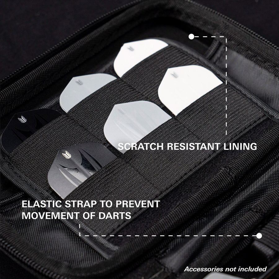 Constructed with a durable hard shell, the XL Takoma keeps your darts safe and protected. The scratch-resistant interior lining secures 6 fully assembled darts, with expanded space for spare flights, shafts, Swiss Points, and your Swiss Point tool — a bold, practical choice for players and fans alike.
